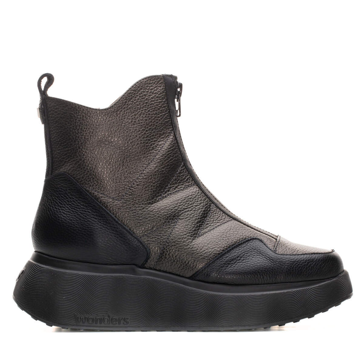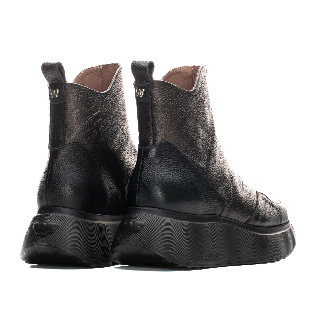 ASHLEY by Wonders is a versatile ankle boot crafted from premium pebbled leather for a sophisticated, textured finish. A sleek front zip with subtle branding and a convenient pull tab ensure easy wear, while the ultra lightweight Wonders Fly® sole delivers all-day comfort and a bold edge. Pair it with jeans, trousers, or midi skirts for an effortlessly polished look—perfect for both work and weekends. Made with love in Spain.