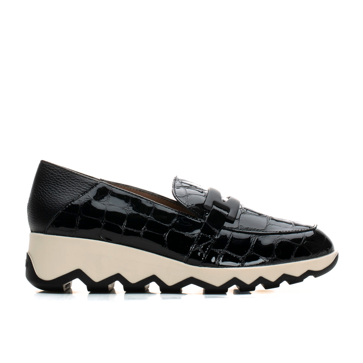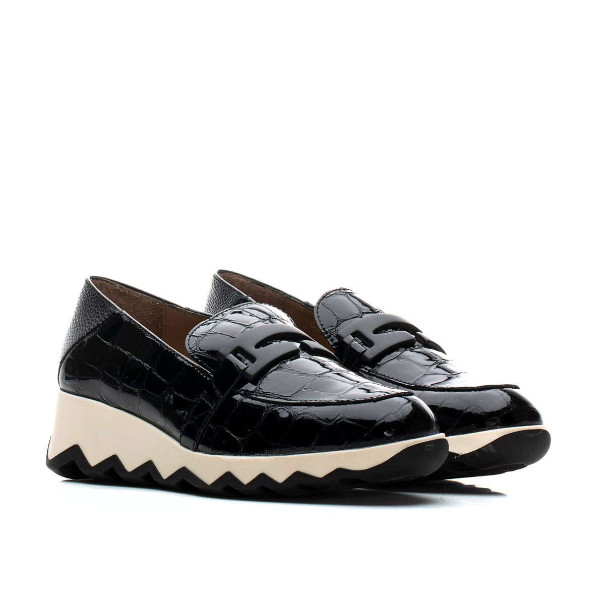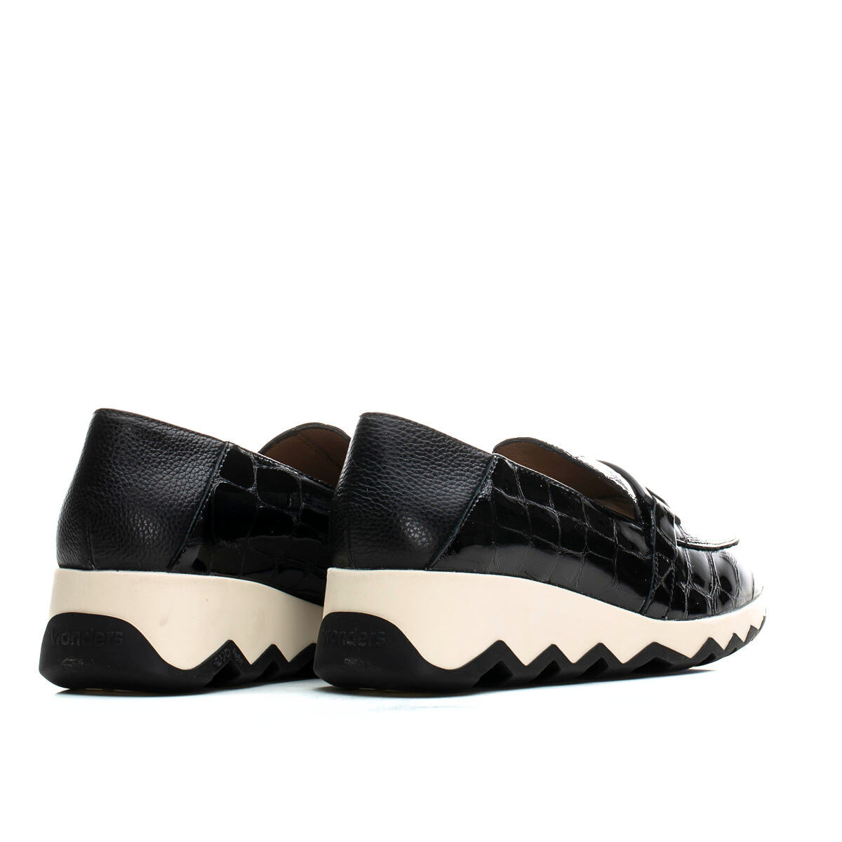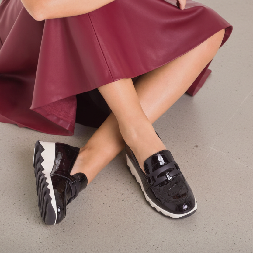 Sophisticated, playful and effortlessly comfortable — CLAUDIA by Wonders is a glossy croc-embossed loafer set on a lightweight sculptural wave sole for modern height and all-day ease. A fun, sporty-luxe twist on a classic silhouette. Easy with tailored pants, denim or a knit dress. Made with love in Spain.