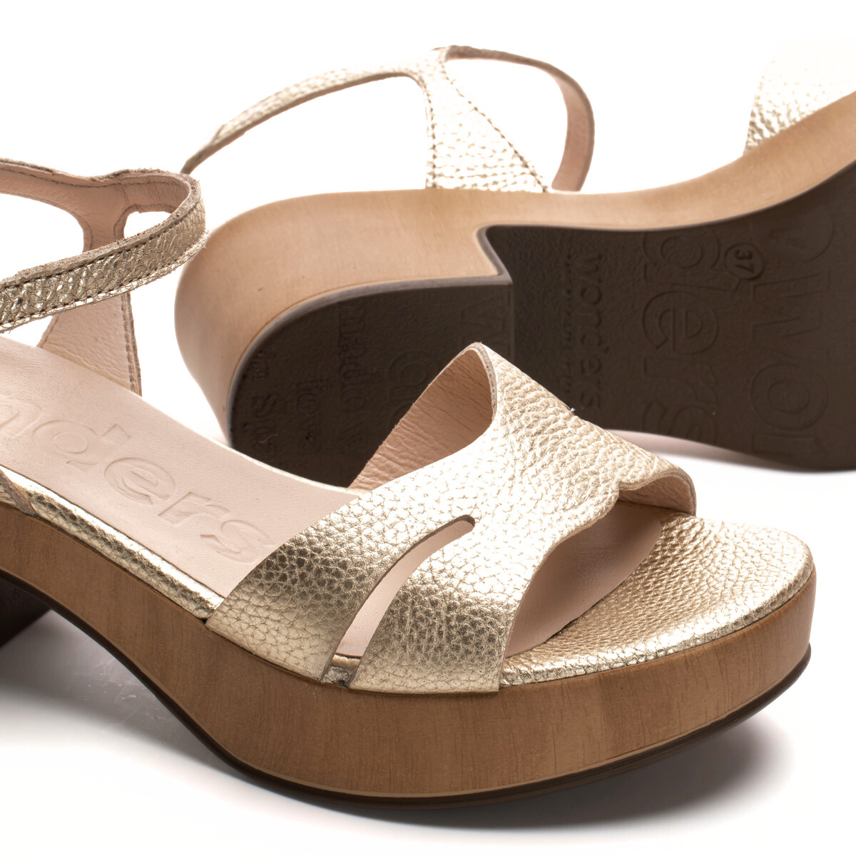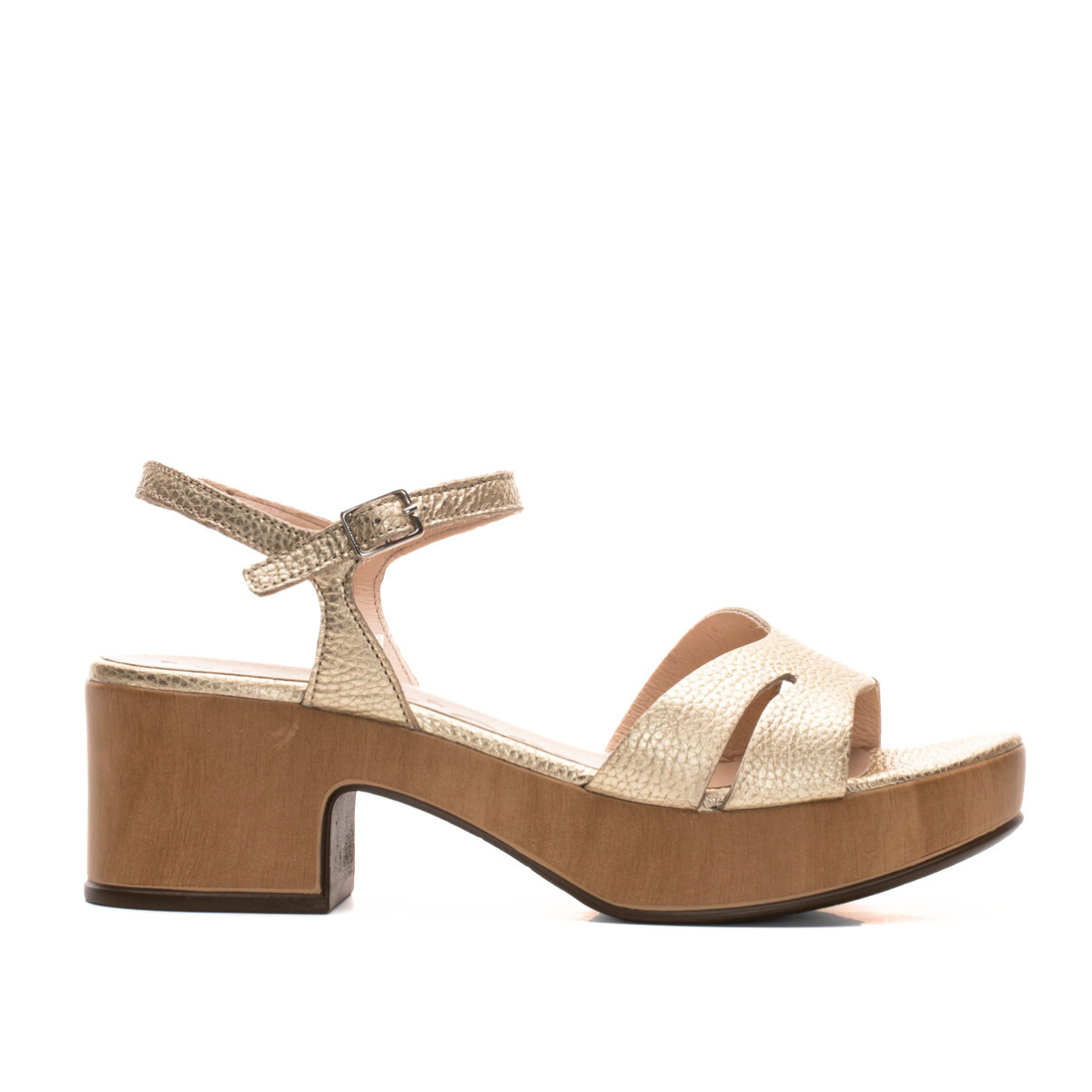 The Daines sandal by Wonders is a fresh take on the classic clog, featuring smooth leather straps, a buckle ankle fastening, and a lightweight wood-look platform with a flared block heel. Finished with a cushioned Memory Gel footbed for comfort that lasts. Style it with wide-leg trousers, cropped jeans, or floaty midi skirts. Made with love in Spain.