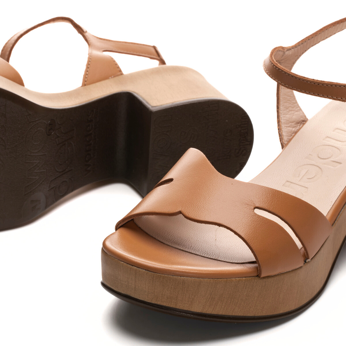 The Daines sandal by Wonders is a fresh take on the classic clog, featuring smooth leather straps, a buckle ankle fastening, and a lightweight wood-look platform with a flared block heel. Finished with a cushioned Memory Gel footbed for comfort that lasts. Style it with wide-leg trousers, cropped jeans, or floaty midi skirts. Made with love in Spain.