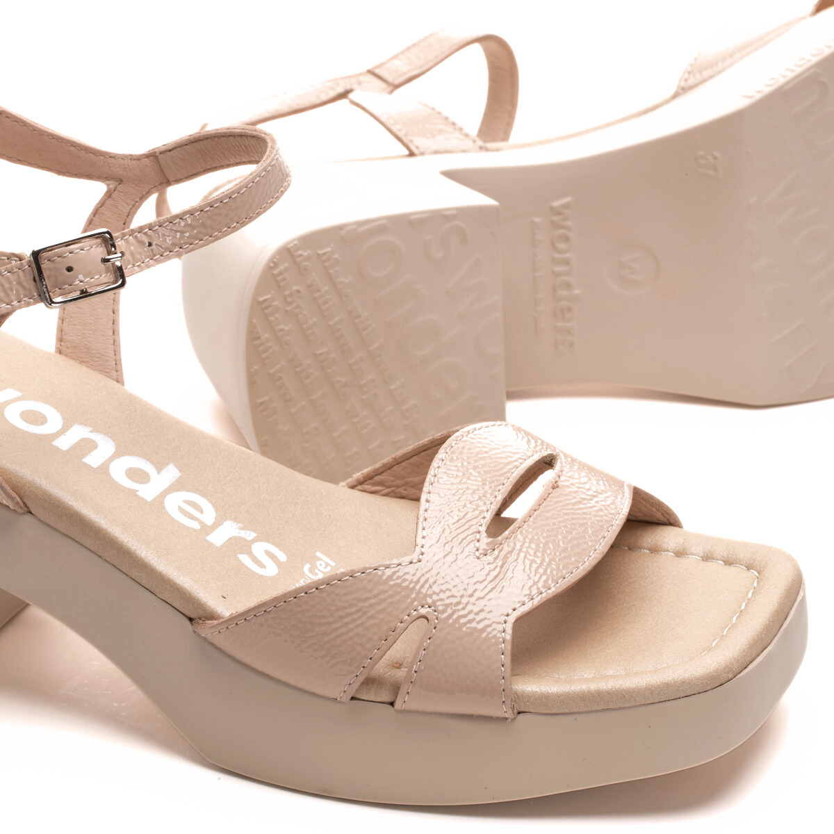 Dalai by Wonders is a sleek, modern sandal with a sculptural block heel and glossy textured leather straps. Designed with an adjustable ankle buckle and a cushioned Memory Gel footbed, it delivers both style and comfort in every step. Effortlessly chic, it pairs perfectly with summer dresses, wide-leg pants, or tailored shorts. Made with love in Spain.