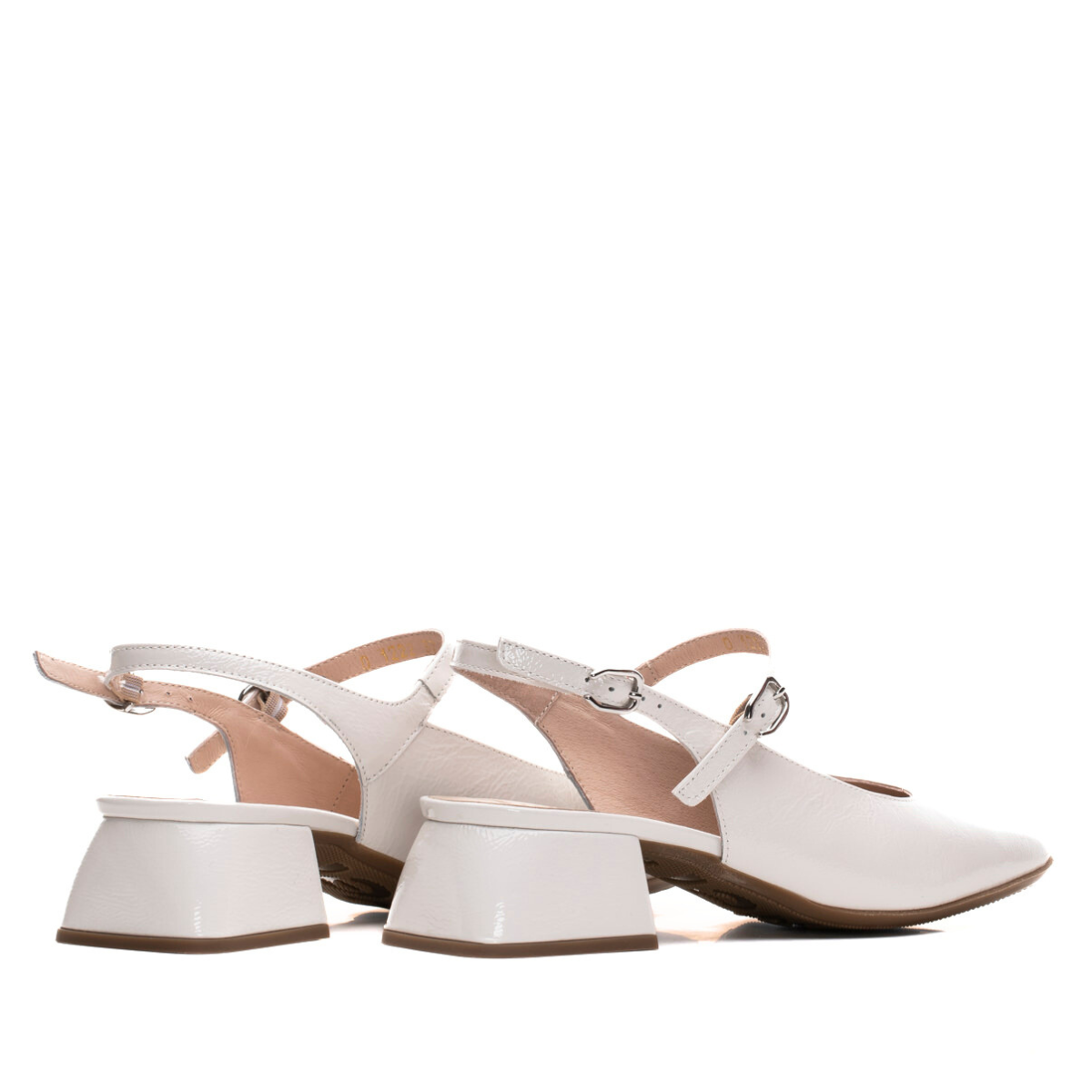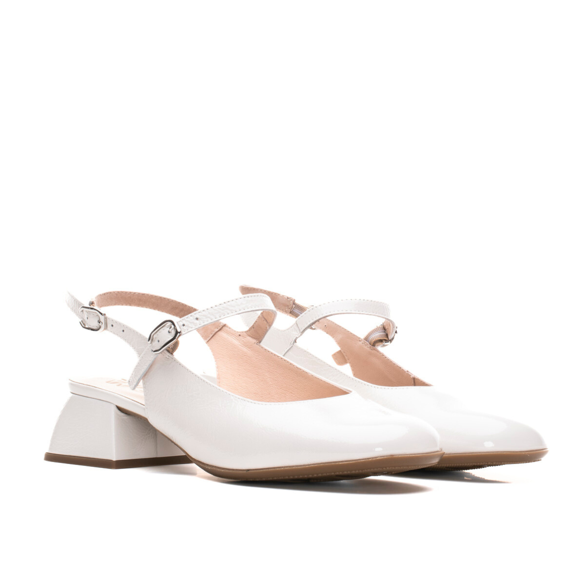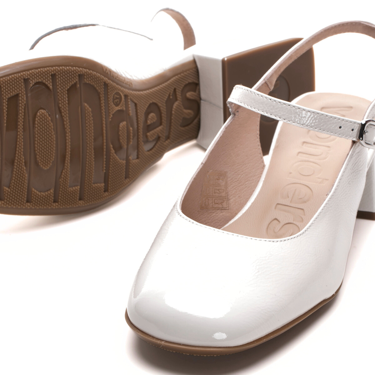 The Django shoe by Wonders is a retro-inspired slingback with a soft patent leather finish, delicate twin straps with buckle detail, a rounded toe, and a sculpted block heel for everyday elegance. Finished with a cushioned Memory Gel footbed for added comfort. Style it with cropped trousers, midi skirts, or a tailored jumpsuit. Made with love in Spain.