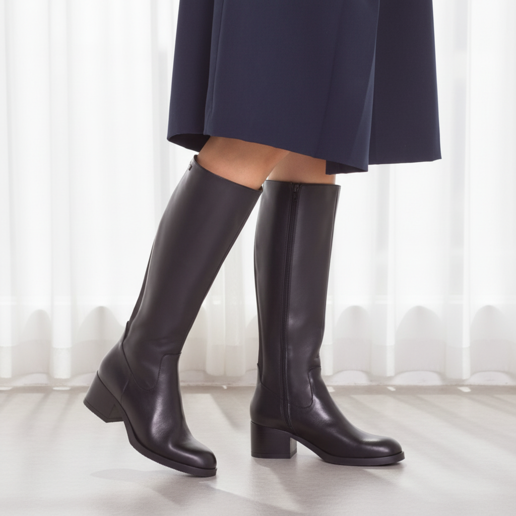 GEMMA by Wonders is a refined knee-high boot crafted in smooth leather with a softly contoured silhouette. Designed with an elasticated rear panel for a comfortable, flexible fit, it sits on a stable block heel that’s easy to wear all day. A timeless style that pairs effortlessly with dresses, skirts or slim denim. Made with love in Spain.