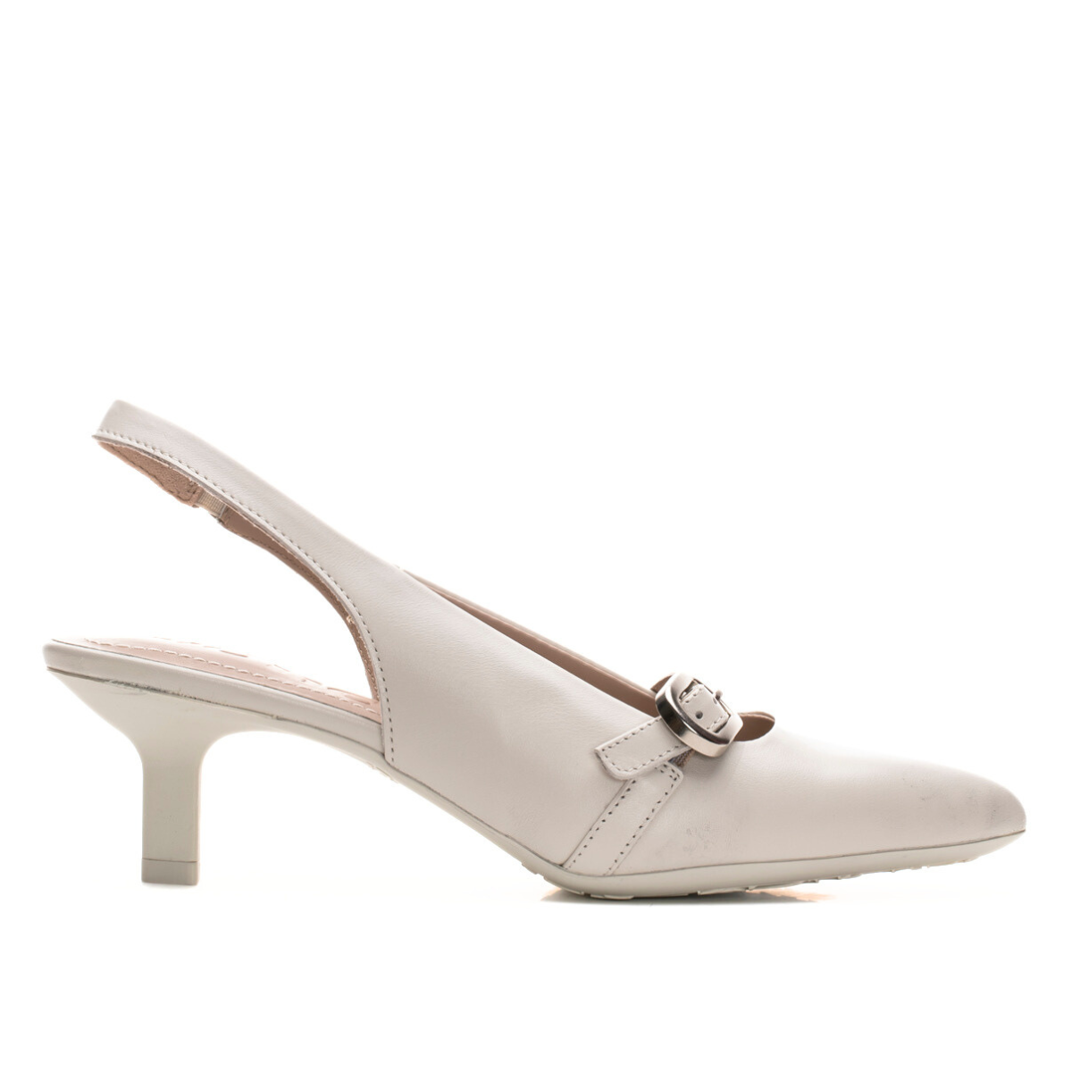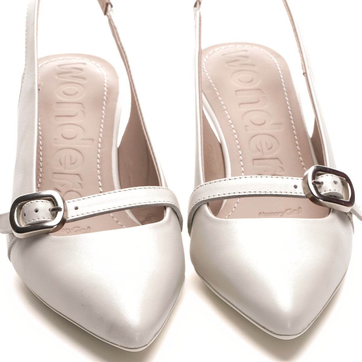 The Global shoe by Wonders is a refined slingback heel crafted in smooth leather with a pointed toe, delicate buckle strap, and a slim tapered heel for an elegant silhouette. Built on a flexible rubber construction last and finished with a cushioned Memory Gel footbed for all-day comfort. Perfect for work, events, or dressy evenings. Made with love in Spain.