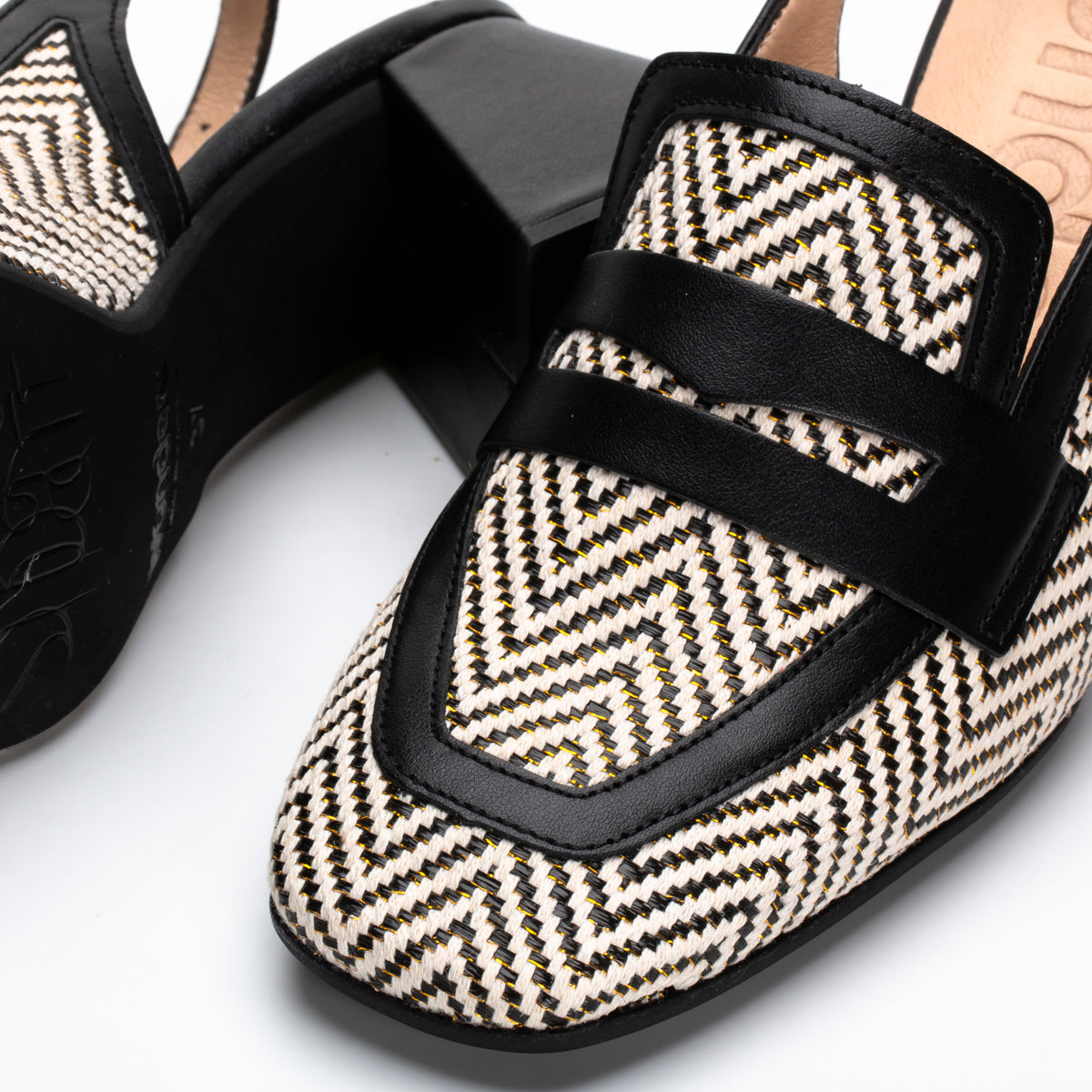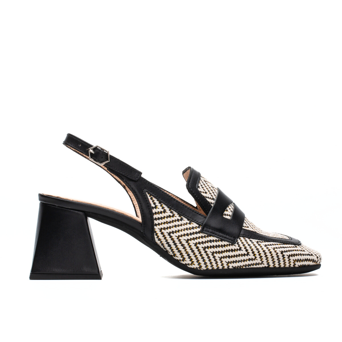 Step into sophistication with HESTRA by Wonders. These exquisite sling-backs showcase a striking textile herringbone pattern paired with sleek leather accents. The unique geometric block heel adds contemporary flair and stability. Perfect for any occasion, HESTRA beautifully complements tailored pants, skirts, or summer dresses. Made with love in Spain.