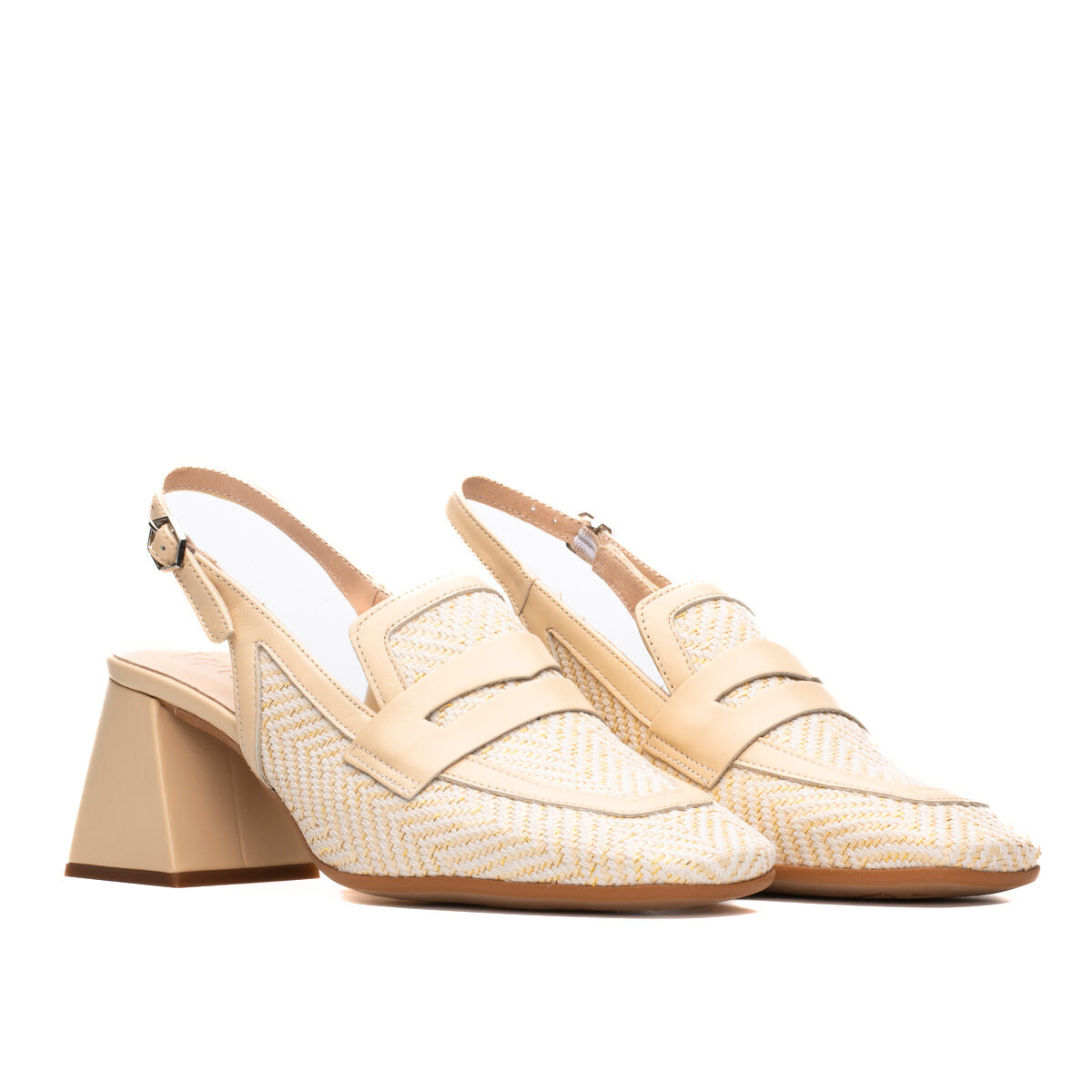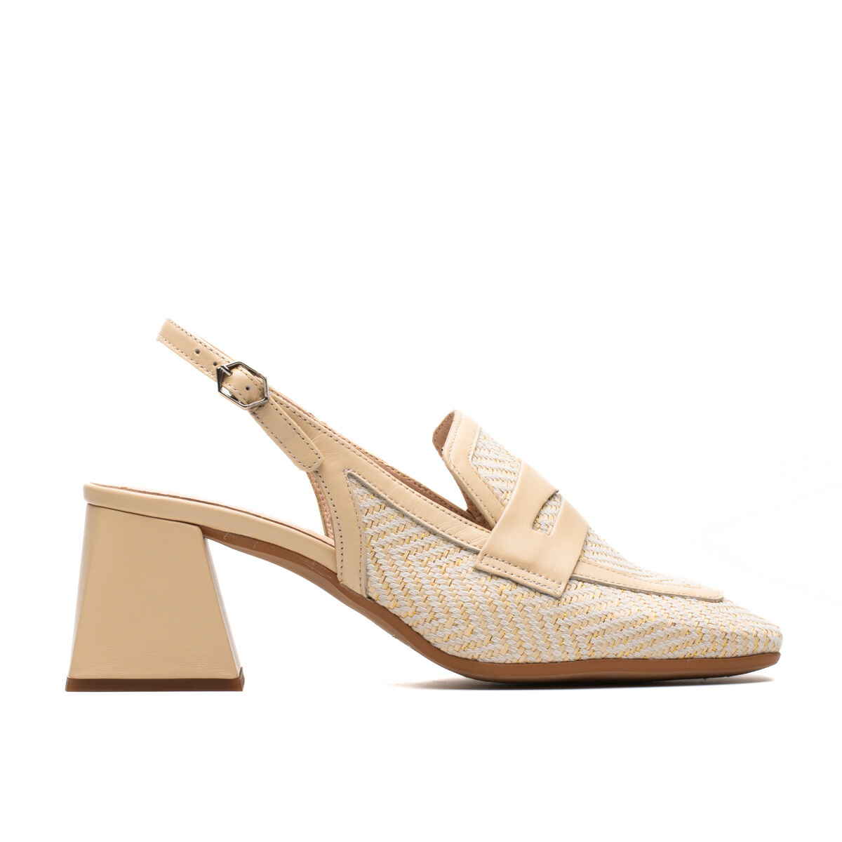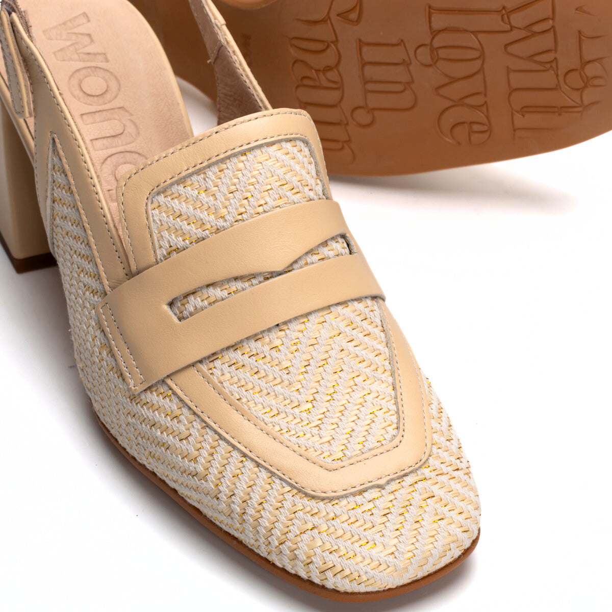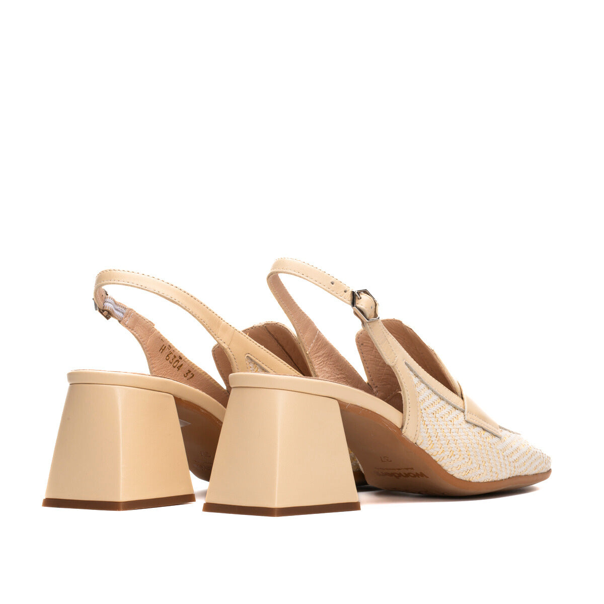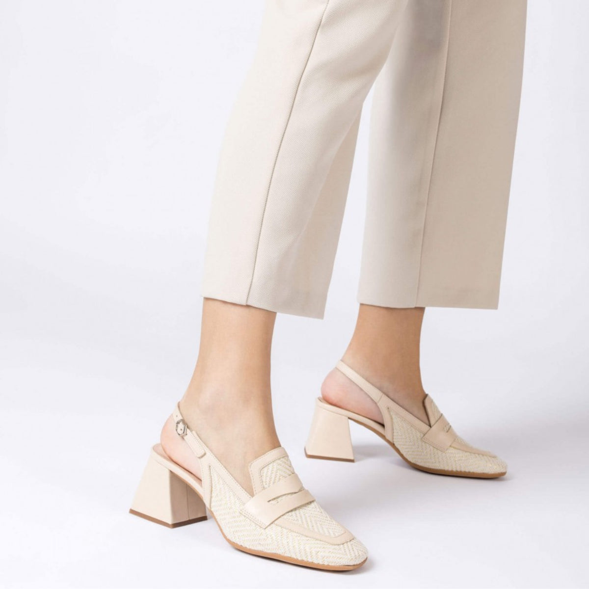 Step into sophistication with HESTRA by Wonders. These exquisite sling-backs showcase a striking textile herringbone pattern paired with sleek leather accents. The unique geometric block heel adds contemporary flair and stability. Perfect for any occasion, HESTRA beautifully complements tailored pants, skirts, or summer dresses. Made with love in Spain.
