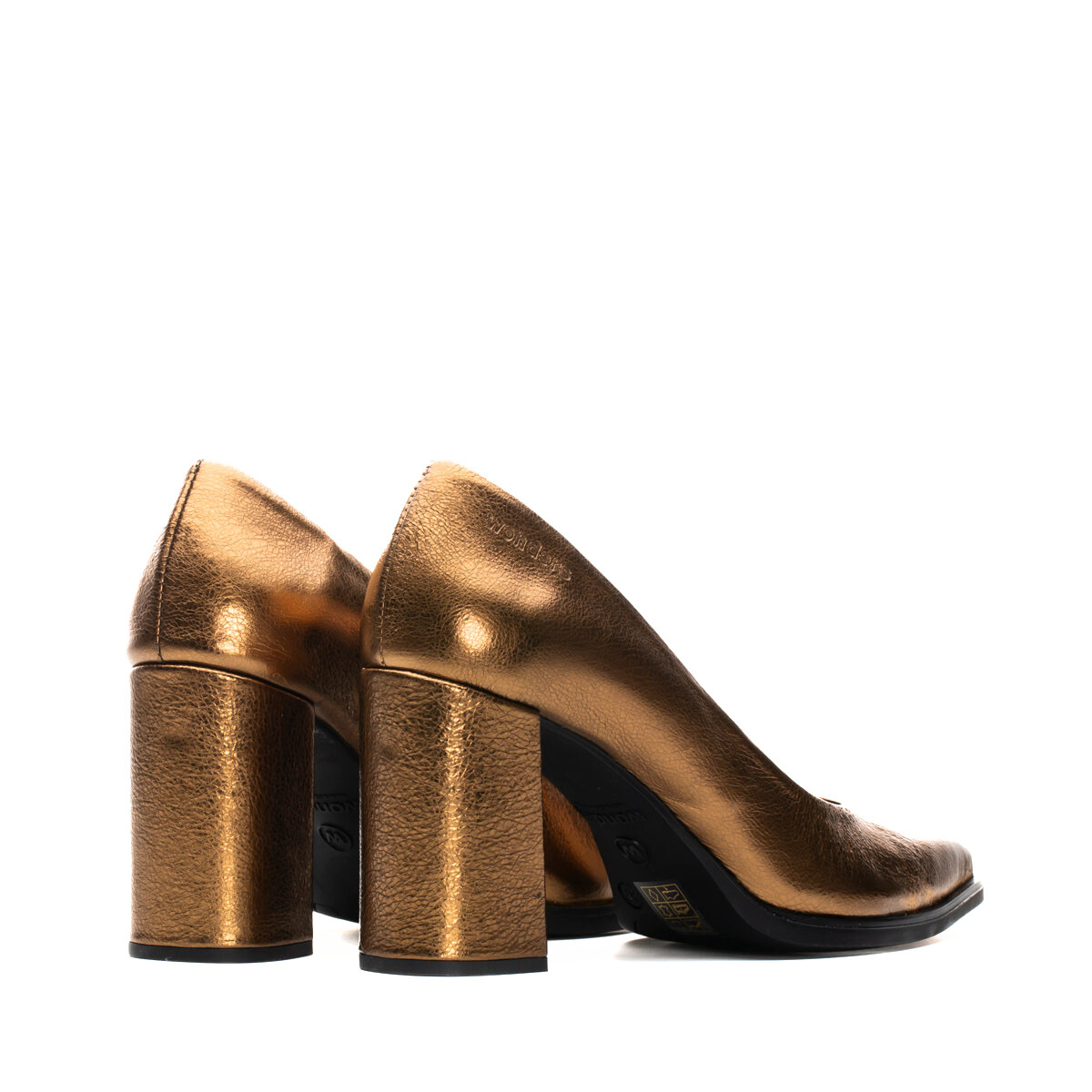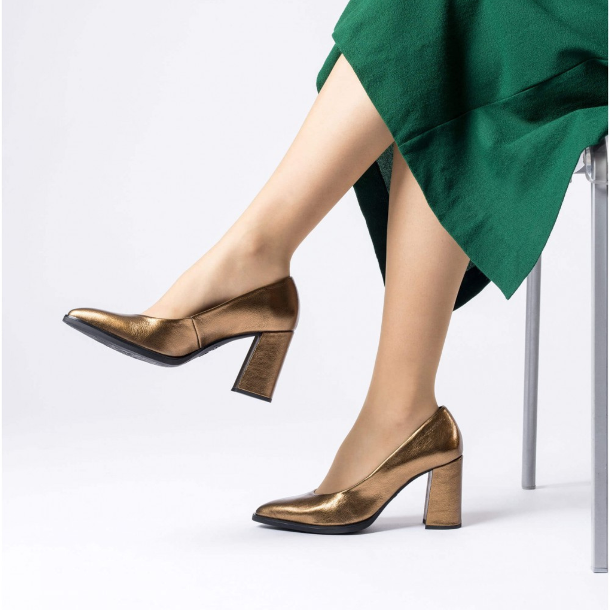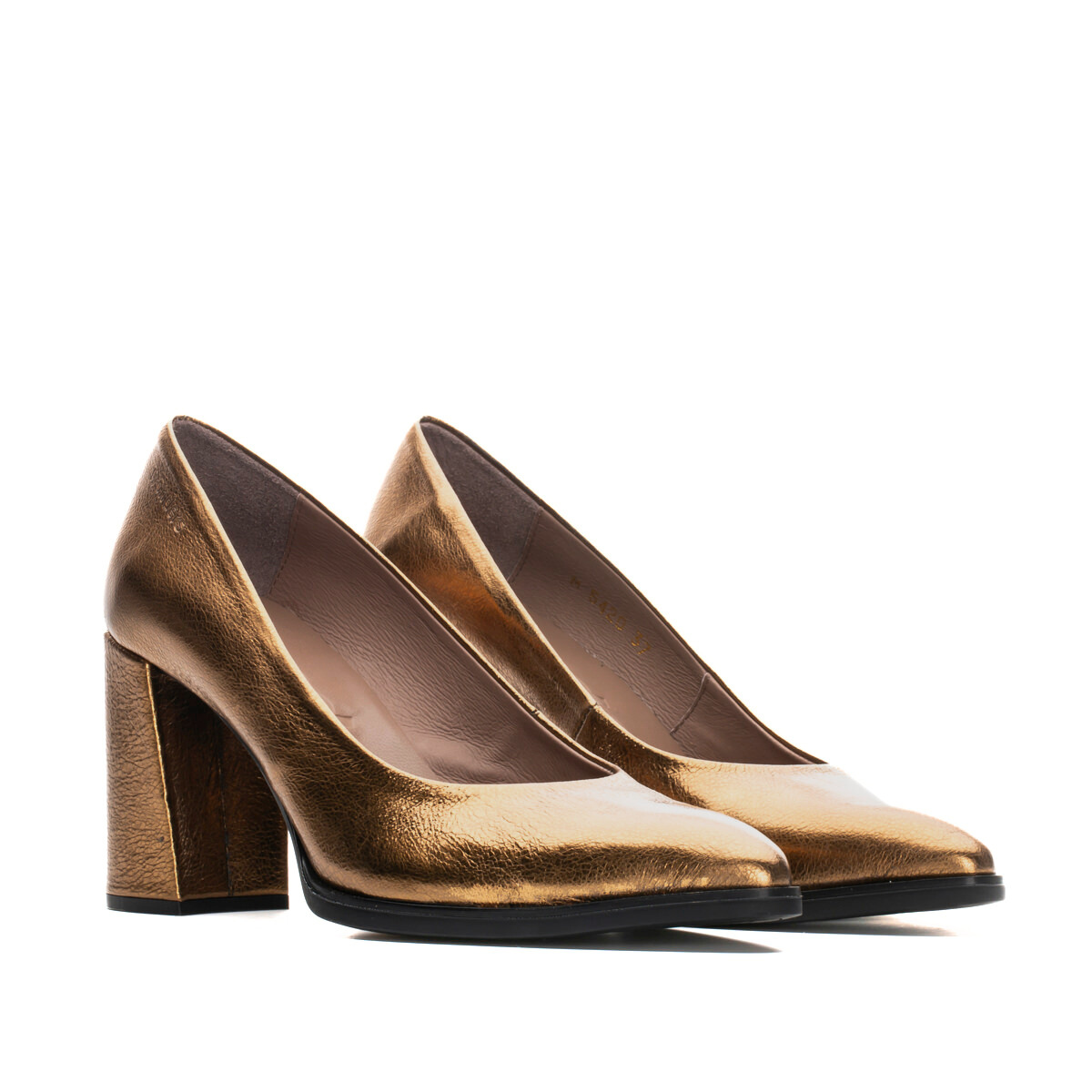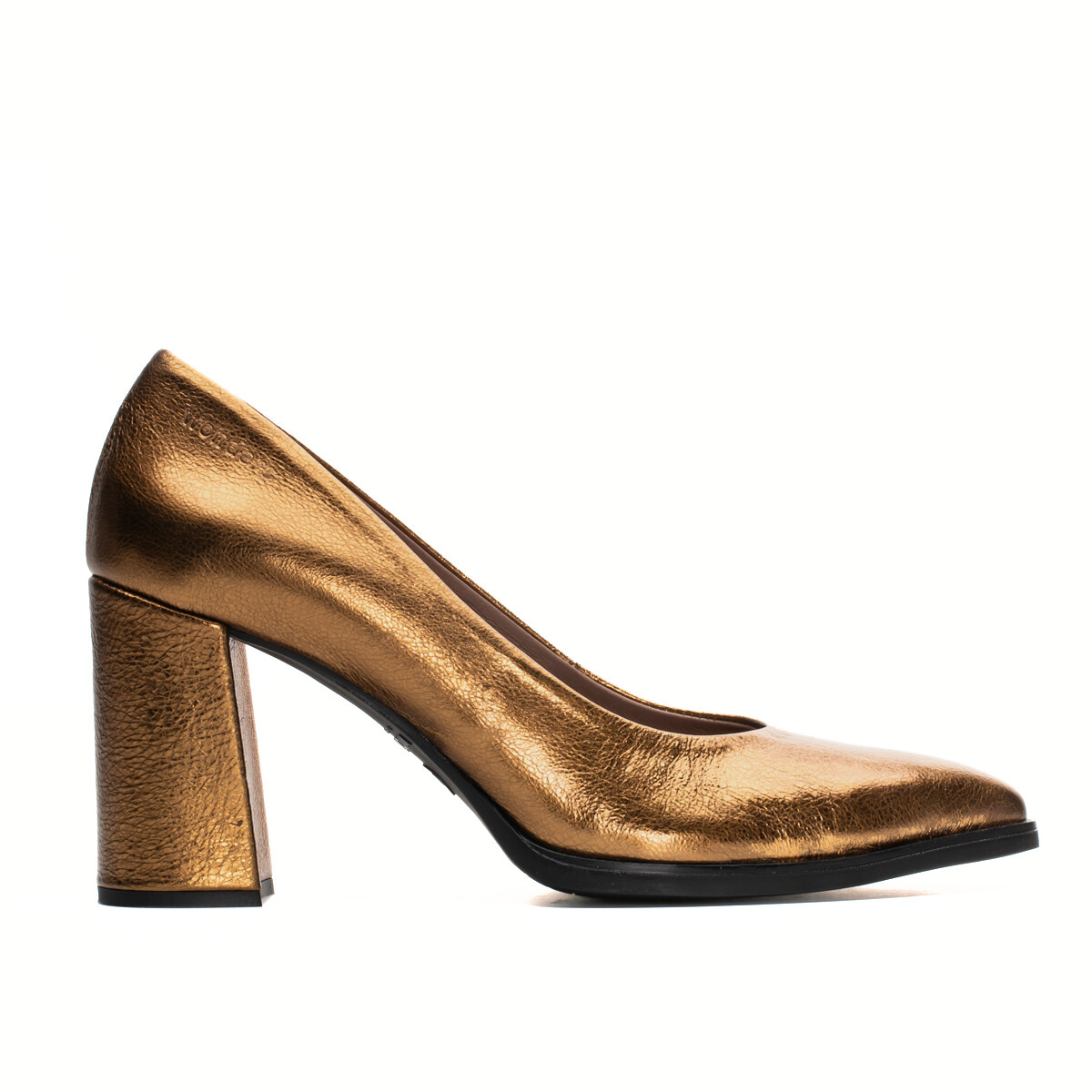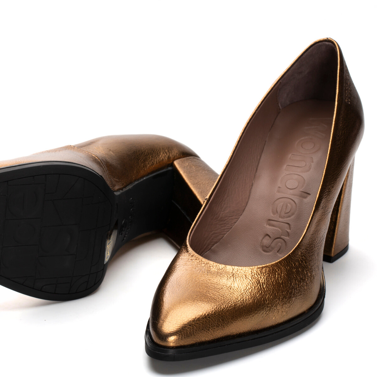 MARINE by Wonders is a stunning metallic pump that combines modern sophistication with effortless style. Featuring a sleek pointed toe and an elevated block heel, this shoe adds a chic, head-turning touch to any outfit. With a flexible rubber outsole for steady traction, it's perfect for pairing with tailored suits or flirty skirts to make a polished statement. Made with love in Spain.